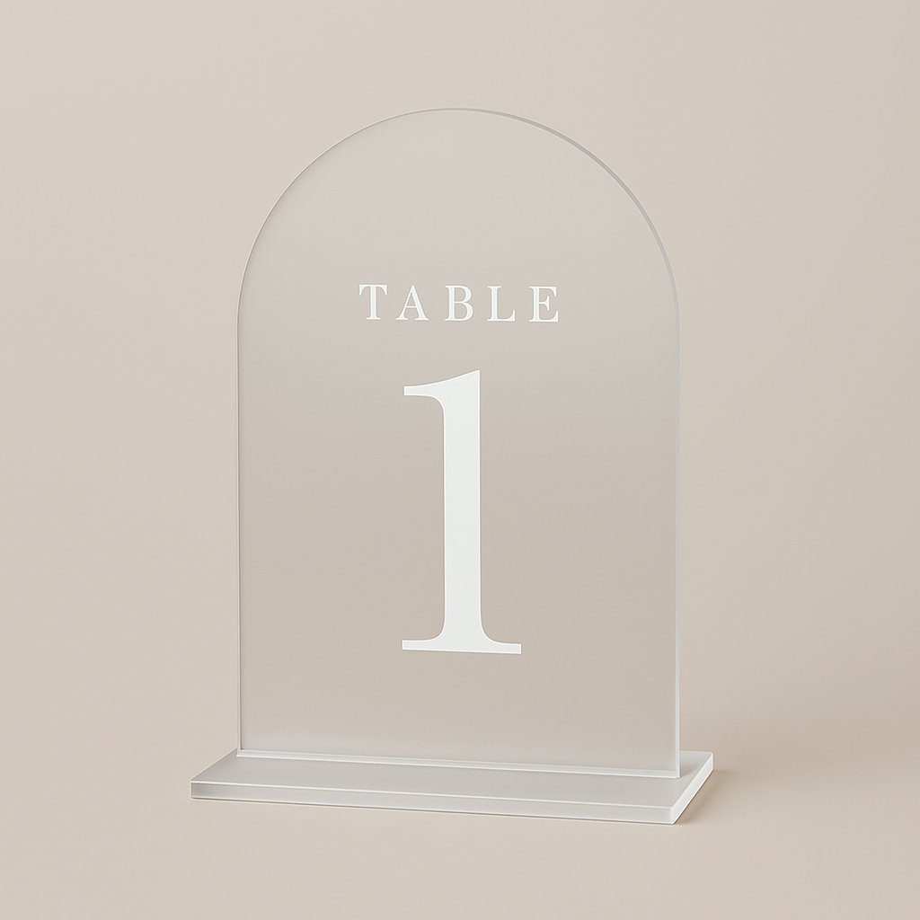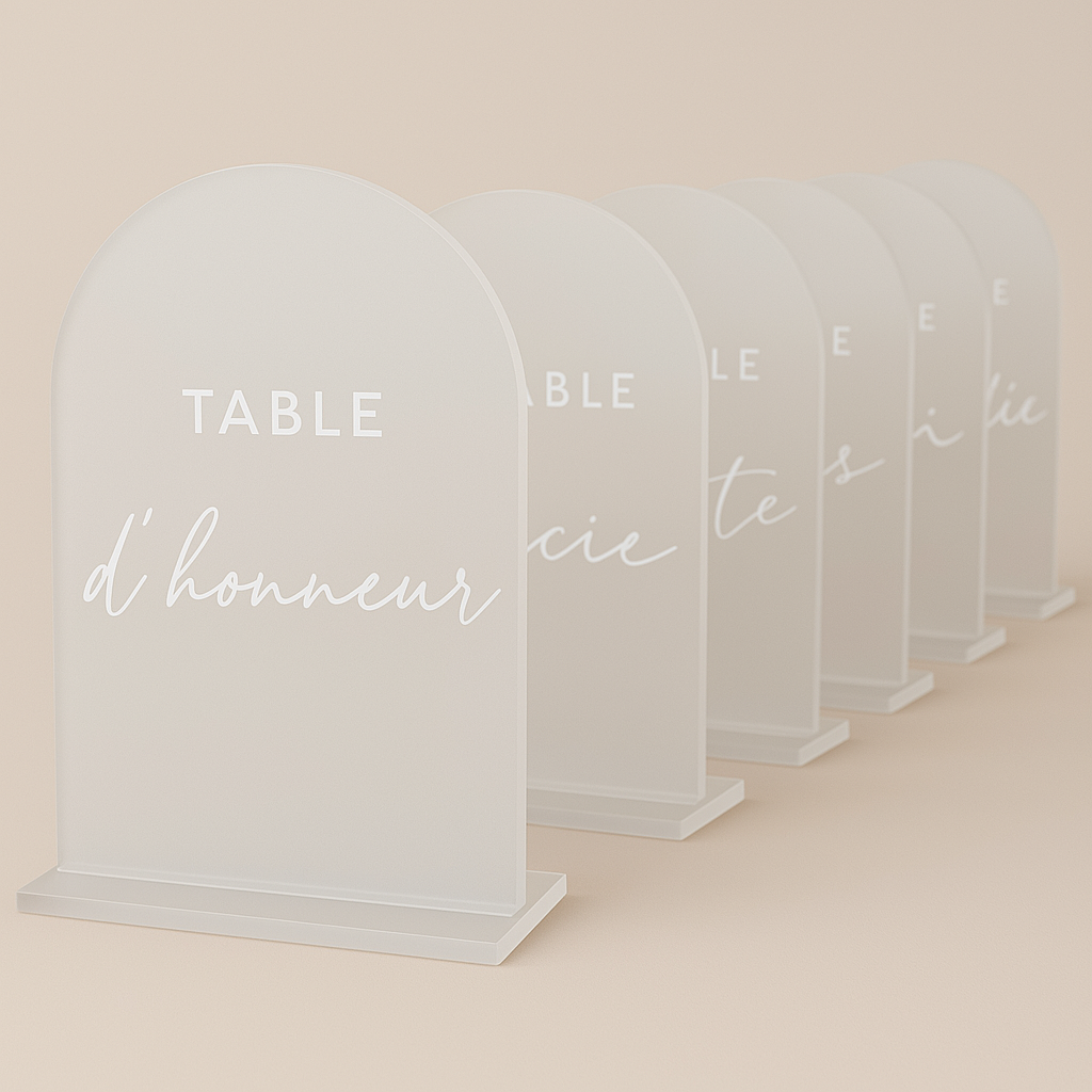 Nos numéros de table en acrylique givré ajoutent une touche chic et minimaliste à votre réception. Parfaits pour une ambiance moderne, raffinée et intemporelle, ils guident vos invités avec style tout en s’harmonisant à votre décor.